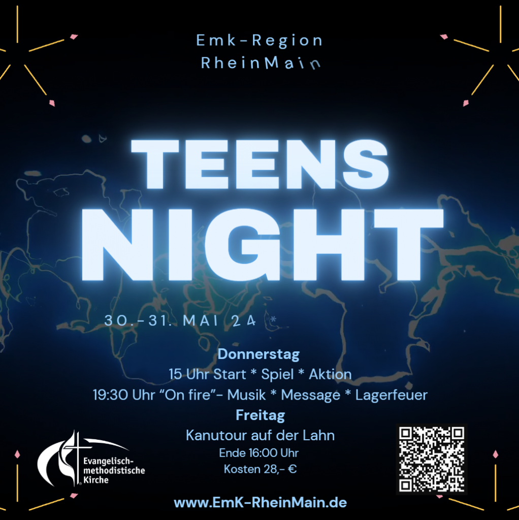 Ende Mai treffen wir uns zur ersten Teens-Night in der Region RheinMain. Wir treffen uns am Donnerstag (Feiertag!) ab 15 Uhr in der EmK Brombach und starten in eine bewegte Nacht, die es in sich hat: Musik, Spiel, Lagerfeuer... Wir übernachten in der EmK-Brombach...